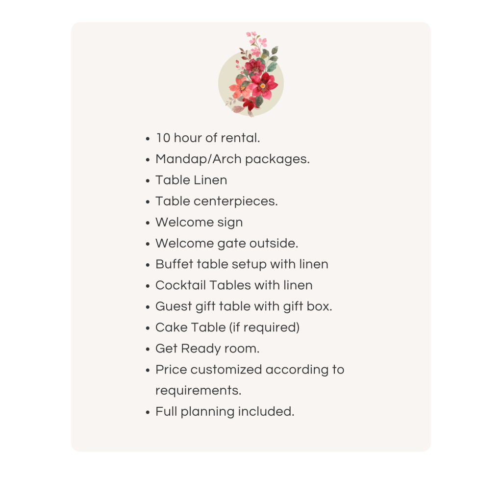 We are offering “Hallway to welcome your guests, 2000 sq ft banquet hall with high ceilings, chandelier to upscale your event, connected lounge & get ready room.
